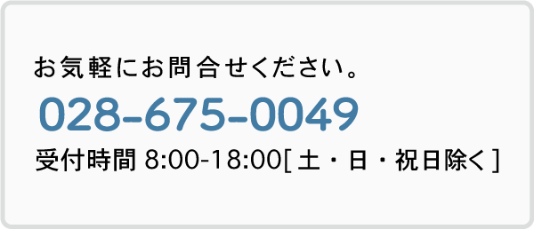 お気軽にお問い合わせください。028-675-0049受付時間 8:00-18:00 [ 土・日・祝日除く ]