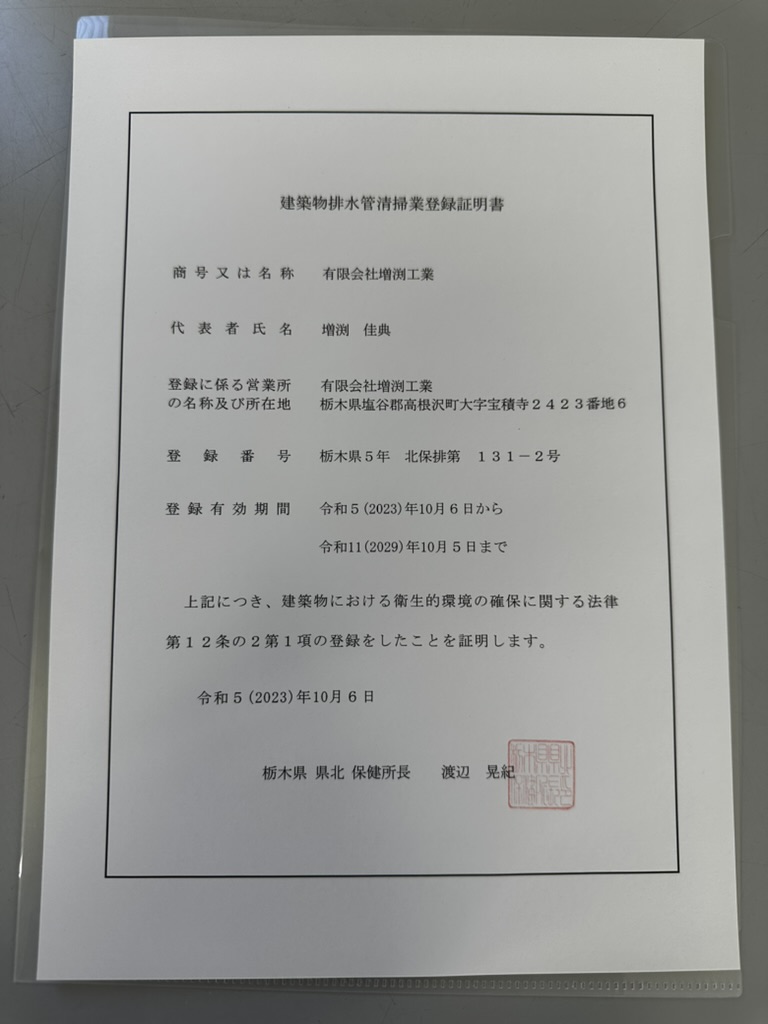 排水管清掃において、県知事の登録を受けております(建築物排水管清掃業登録証 登録番号 栃木県5年北保排第 131ー2号)。これにより、セキュリティと法的要件への信頼性を確保しています。